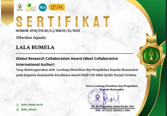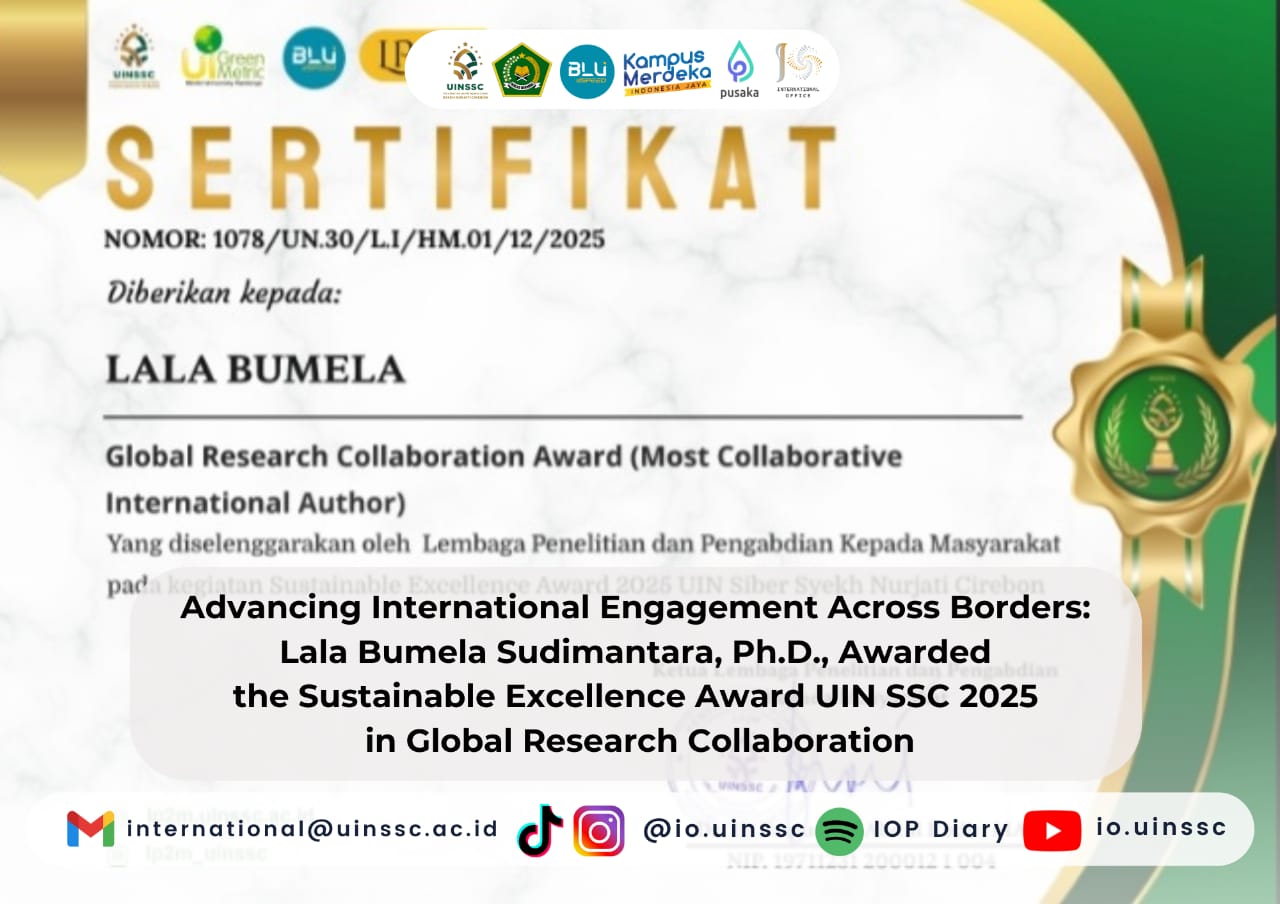 Cirebon, February 8, 2026 — Lala Bumela Sudimantara, Ph.D., Director of the International Office of UIN Siber Syekh Nurjati Cirebon (UIN SSC), has been awarded the Sustainable Excellence Award 2025 in the category of Global Research Collaboration (Most Collaborative International Author). The award was formally granted following the Decree of the Head of the Institute for Research and Community Service issued on December 31, 2025. This prestigious recognition represents the university’s highest appreciation for sustained contributions to research excellence and social impact. The award highlights the role of international collaboration as a strategic pillar in institutional sustainability. Through this achievement, UIN SSC underscores its commitment to globally engaged and ethically grounded scholarship. The recognition further reflects the growing influence of UIN SSC within international academic landscapes.