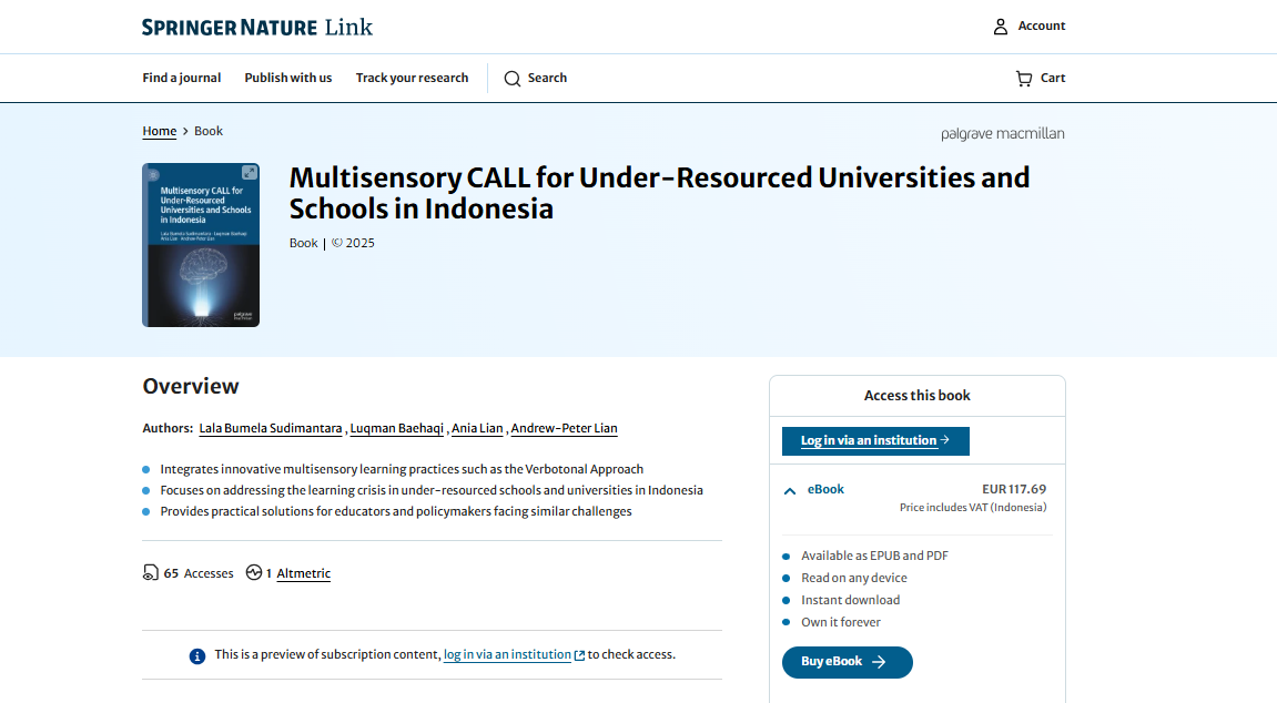 The strength of his global research engagement was further evidenced in 2025 through his contribution as one of the authors of the book Multisensory CALL for Under-Resourced Universities and Schools in Indonesia. The publication was developed in collaboration with Luqman Baehaqi (UIN Palangka Raya, Indonesia) alongside internationally renowned scholars Ania Lian (Charles Darwin University, Australia), and Andrew Lian (Suranaree University of Technology, Thailand, and The University of Canberra, Australia). The book has been distributed internationally, reaching academic audiences across the Nordic region, the United States, Germany, and Japan. Through this scholarly work, Lala Bumela Sudimantara, Ph.D. advanced two core pillars of the Sustainable Development Goals in education: innovation and interdisciplinarity. The publication bridges technology, equity, and contextual relevance in language education. It also positions Indonesian scholarship as an integral contributor to global academic discourse.