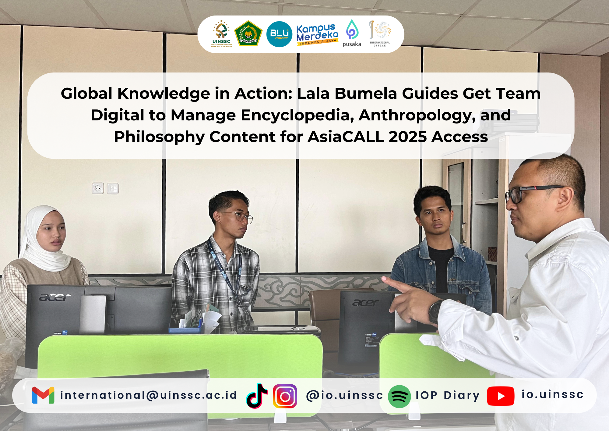 Cirebon, September, 22nd 2025 — Global knowledge has increasingly been digitized across social media and online platforms, creating opportunities for academic institutions to reach wider audiences. For the 22nd AsiaCALL Conference, which will be held at UIN Siber Syekh Nurjati Cirebon, meticulous preparation is required, particularly in the creation and management of digital content. Following collaboration with PIPD (Pusat Inovasi Pembelajaran Digital), Lala Bumela provided detailed guidance to the International Office’s Global Engagement Team (GET) Digital Content, consisting of Indra Maulana Arfan Ajiz, Bustanul Arifin, and Keysha Aulia Febrina. He outlined the plan and concept for AsiaCALL content, emphasizing that all materials should be grounded in local wisdom and integrated with artificial intelligence, elaborated alongside diverse philosophical frameworks. “Every piece of content we produce must have a philosophical foundation and represent the academic and cultural identity of UIN Siber Syekh Nurjati Cirebon,” said Lala Bumela.