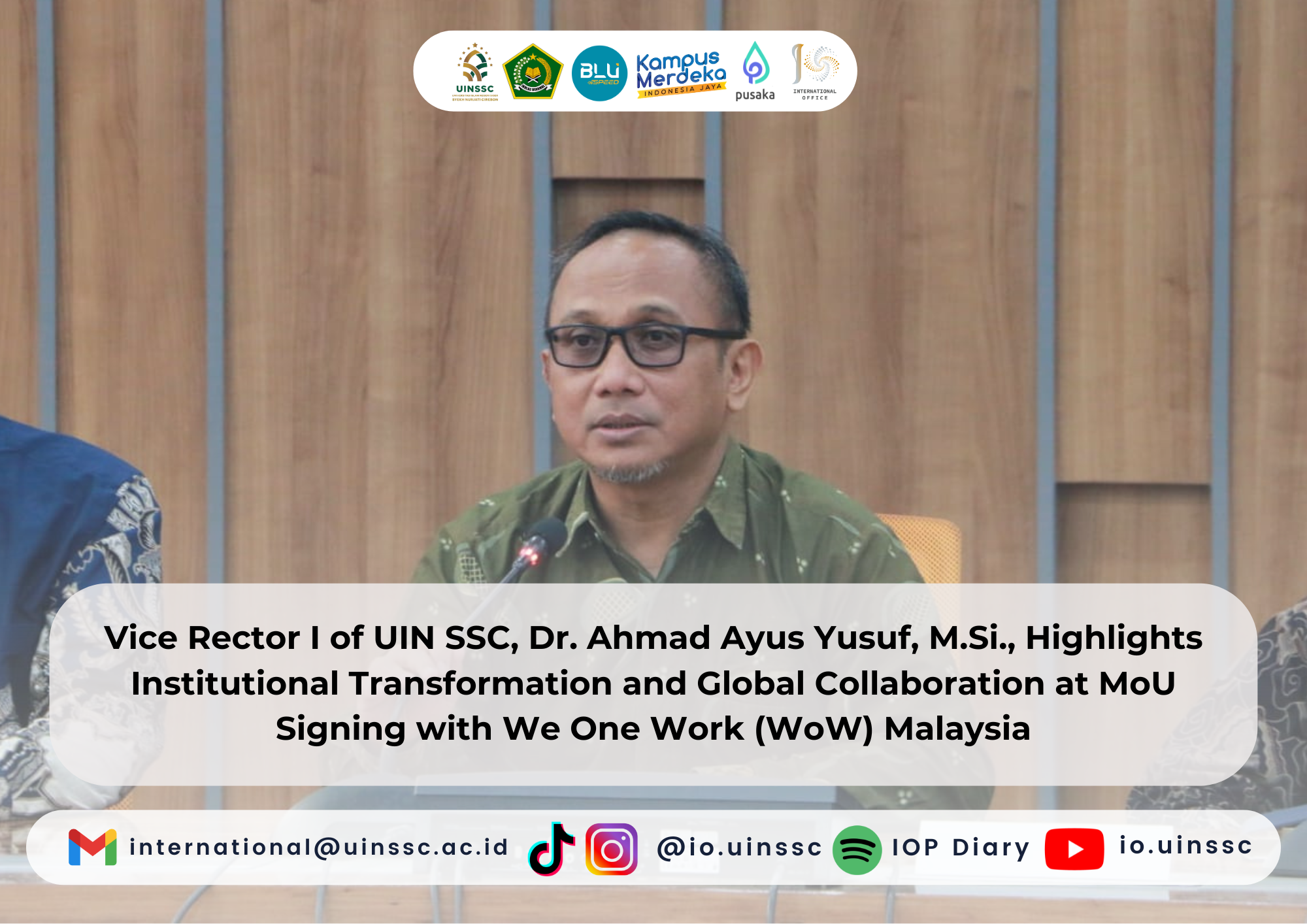 Cirebon, March 9, 2026 — Dr. Ahmad Ayus Yusuf, M.Si., Vice Rector I of UIN Siber Syekh Nurjati Cirebon (UIN SSC), delivered a welcoming address during the signing of a Memorandum of Understanding (MoU) between UIN SSC and We One Work (WoW), Malaysia. The ceremony was held in the Senate Room on the second floor of the UIN SSC’s Rectorate Building and attended by key representatives from both WoW Malaysia and UIN SSC. Among the UIN SSC attendees were Dr. Ayus Ahmad Yusuf, M.Si., (Vice Rector I), Prof. Dr. Hajam, M.Ag., (Vice Rector III), Lala Bumela Sudimantara, Ph.D. (Director of the International Office), Wahyono, S.Pd.I., M.Pd.I. (Head of the Career Development Center), Dr. Maulidiya Ulfah, M.Pd., (the Institute for Research and Community Service/LP2M), Zainal Arifin, S.Ag. (Head of Academic and General Administration), Dr. Naila Farah, M.Ag. (Dean of FDKI), Dr. Arief Rachman, M.Si. (Vice Dean I of FDKI), Dr. Naeila Rifatul Muna, M.Pd.I. (Vice Dean II of FUA), Dr. Asep Mulyana, M.Si. (Vice Dean III of FITK), and Dr. H. Achmad Otong Busthomi, M.Ag. (Head of the Sharia Economics Department). In his remarks, Dr. Ahmad Ayus Yusuf warmly welcomed the WoW delegation and expressed his pleasure at meeting the representatives in person.